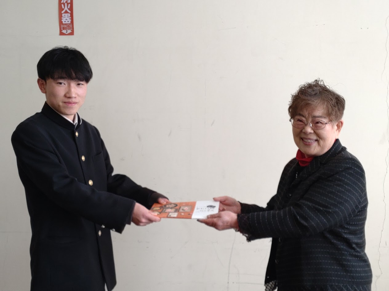 ふるさとの味を受け継いでほしい」と願いを込め、生徒代表へ直接手渡しました。