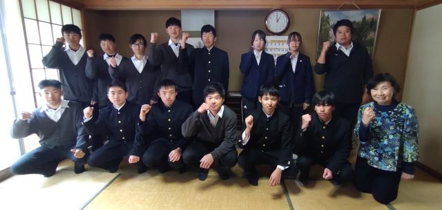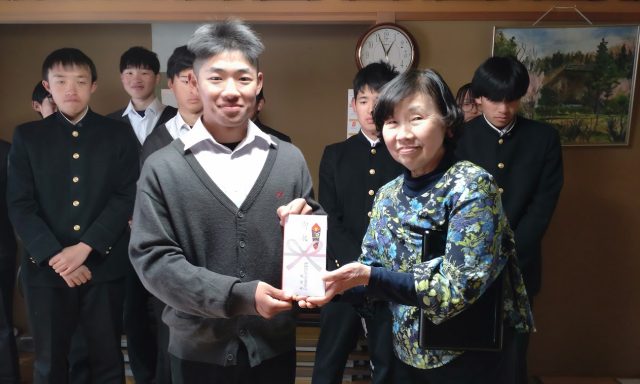 本日、校内の同窓会館で激励会を行い、下島典子会長から激励金が手渡されました。会長は「しっかり打って守って、そして楽しんで!」と温かいエールを送りました。