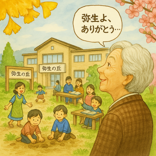 やがて2040年。かつての校庭では子どもたちが泥んこで遊び、校舎では世代を超えた人々が集って、語り合ったり、学んだりしています。どこからか歌声や笑い声が聴こえてきます。83才になった私は、銀杏の木々と桜並木を見上げながら、「弥生よ、ずっと私たちを見守ってくれて、ありがとう」とつぶやきます。